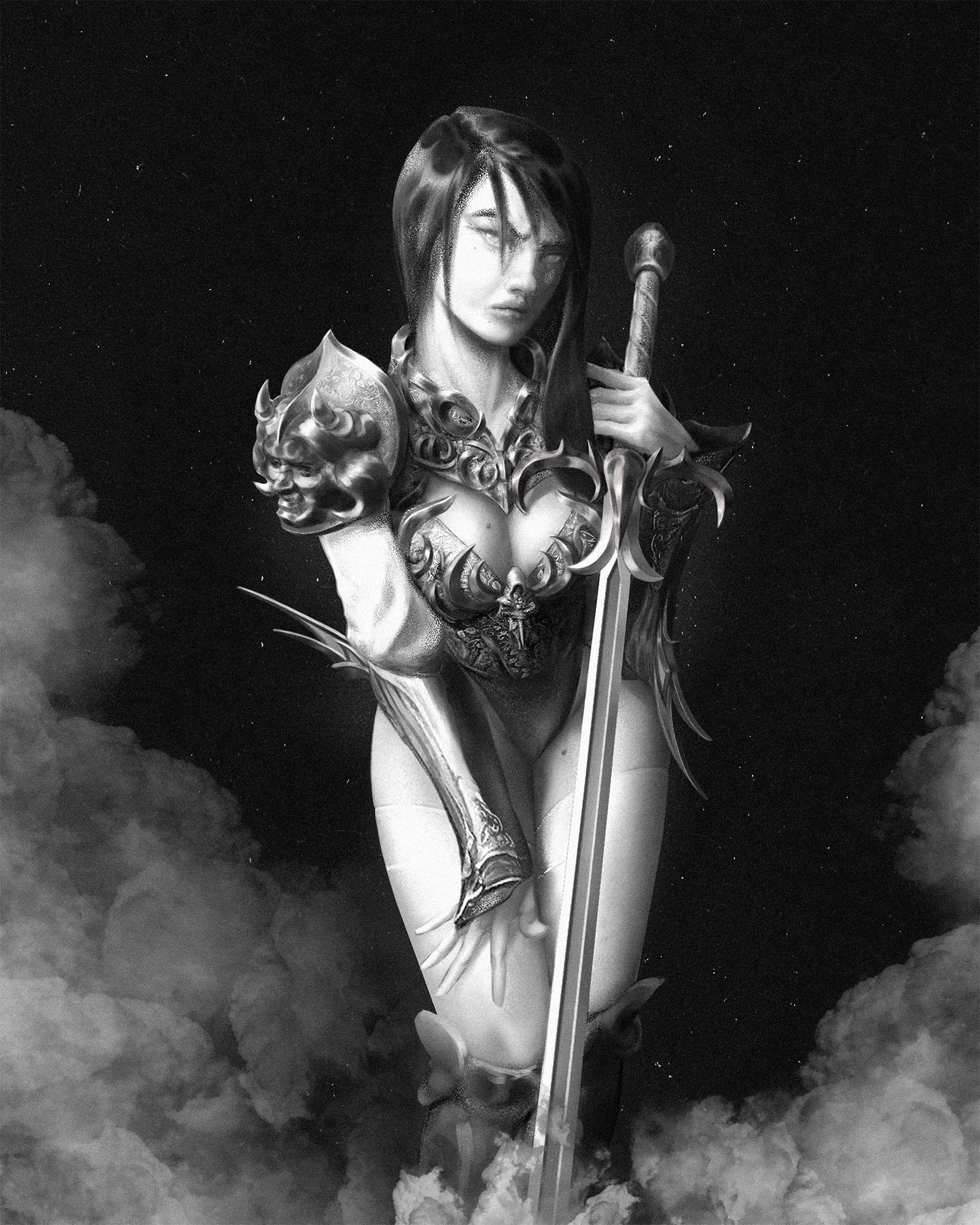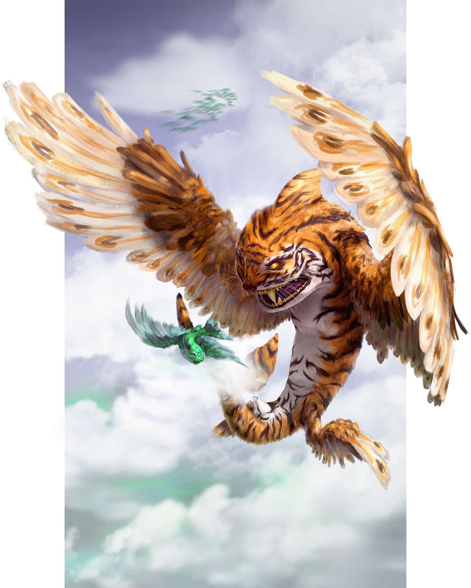 A dynamic fantasy creature design blending the ferocity of a tiger-shark with the grace and power of an owl. This airborne predator hunts through the clouds, capturing a sense of speed, intensity, and natural dominance in the skies.